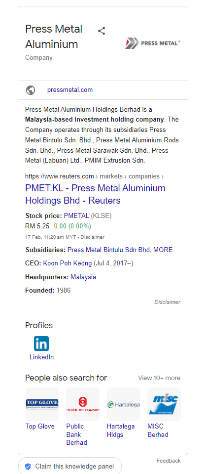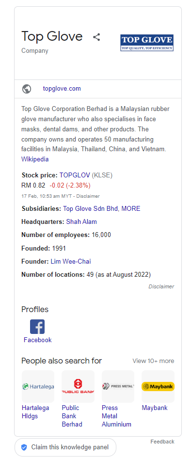 This panel contains all the updated information regarding your business or public figure. It will show the name of the company, website, short description, social media, founder name, stock price if listed in NYSE or Bursa Saham, business location and what people search alongside the keyword.
